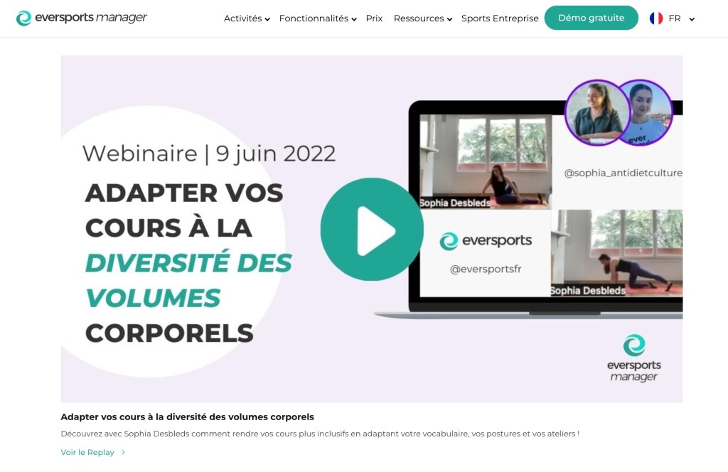 I organised a webinar with Sophia Desbleds about inclusive physical activity, particularly how to adapt yoga classes to all types of bodies. I created a landing page on Eversports Manager to explain the webinar and download the replay.