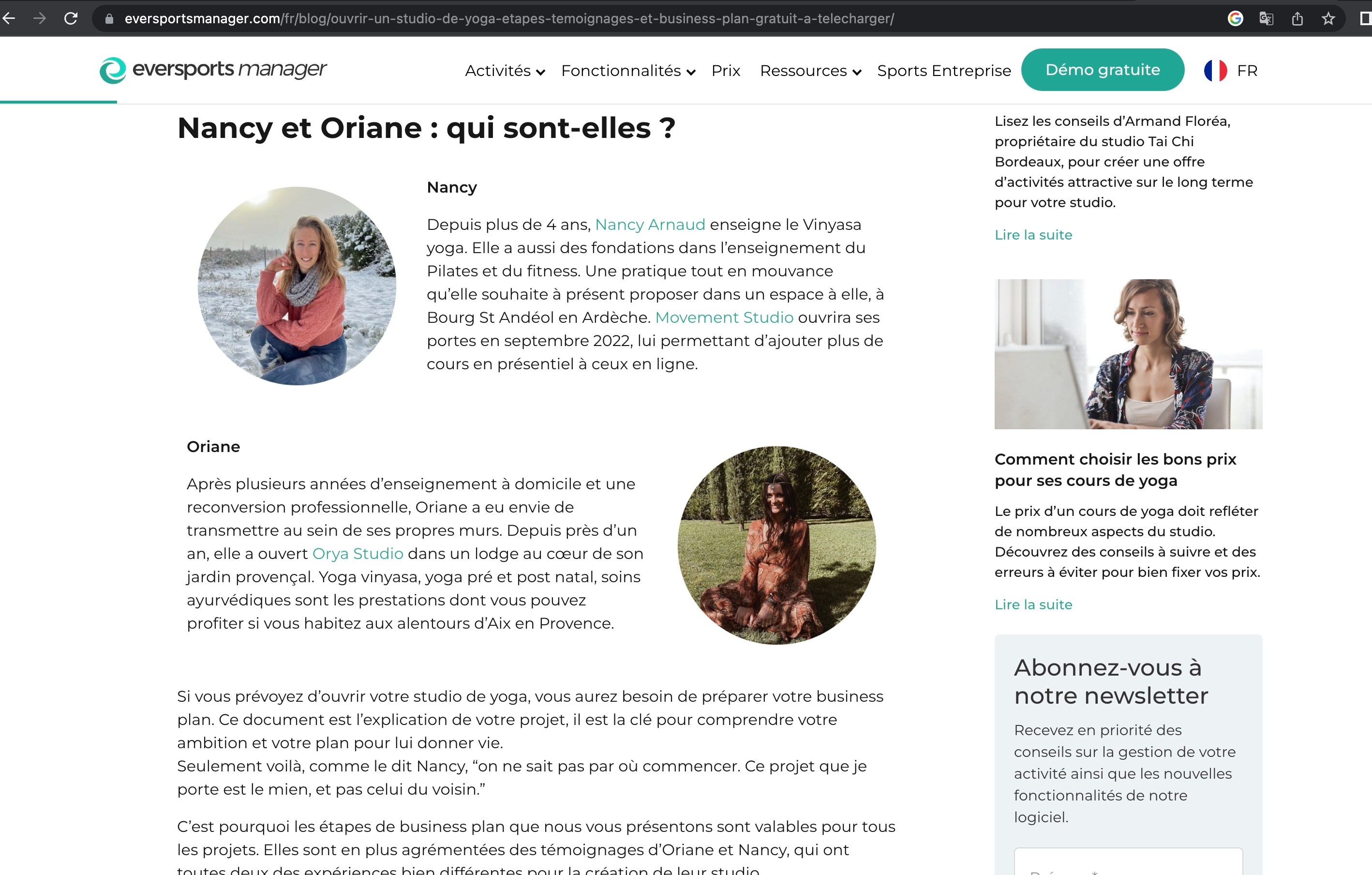 Writing of a blog article about how to create a business plan for yoga studio. It includes testimonies from yoga studio partners interviews. This article is published on Eversports Manager and offers a free downloadable resource.